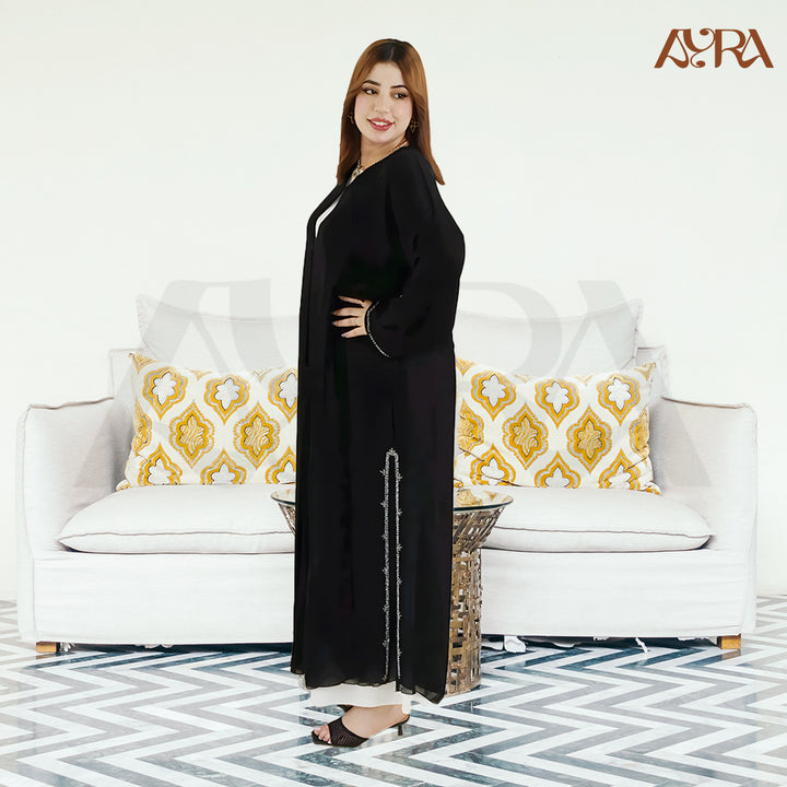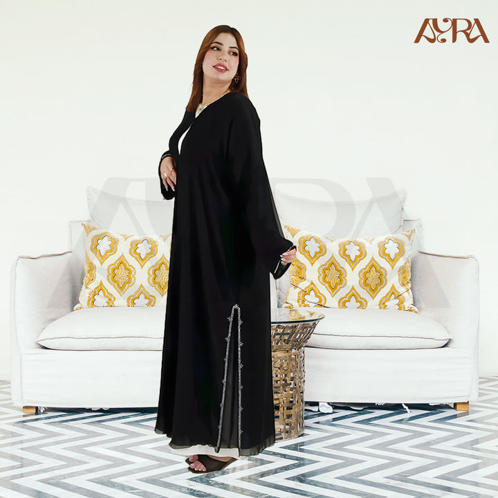 عباية أنيقة بتصميم انسيابي مريح، قماشها ناعم وخفيف على الجسم وفي نفس الوقت متماسك وما يكرمش بسهولة. الأكمام واسعة بشكل بسيط يضيف لمسة أنوثة، والتفاصيل دقيقة تخليها مناسبة للخروج أو المناسبات.